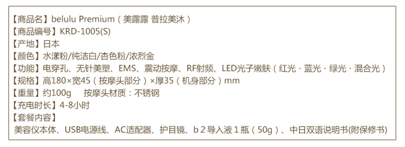| 配件: | USB电源线、充电器、中日双语说明书(附保修书)、护目镜、b2美容液 |